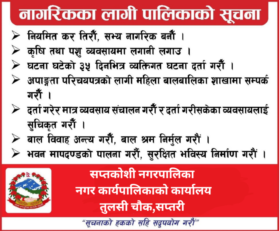 प्रकाशित कुनै सामग्रीबारे कुनै गुनासो, सूचना तथा सुझाव भए हामीलाई saptakoshisanchar@gmail.com मा पठाउनु होला । धन्यवाद ।